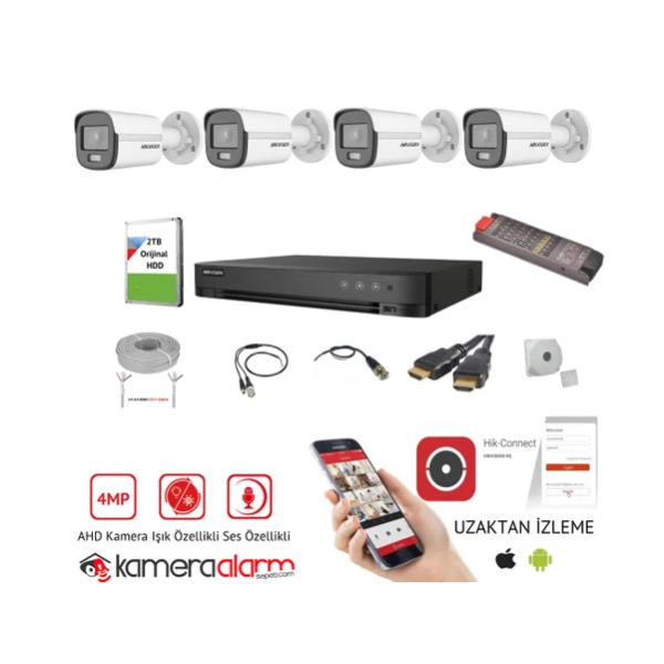 Hikvision 4MP 7/24 Renkli Ses Kayıtlı 4'Lü AHD Kamera Seti - Uzaktan izleme - 2TB HDD