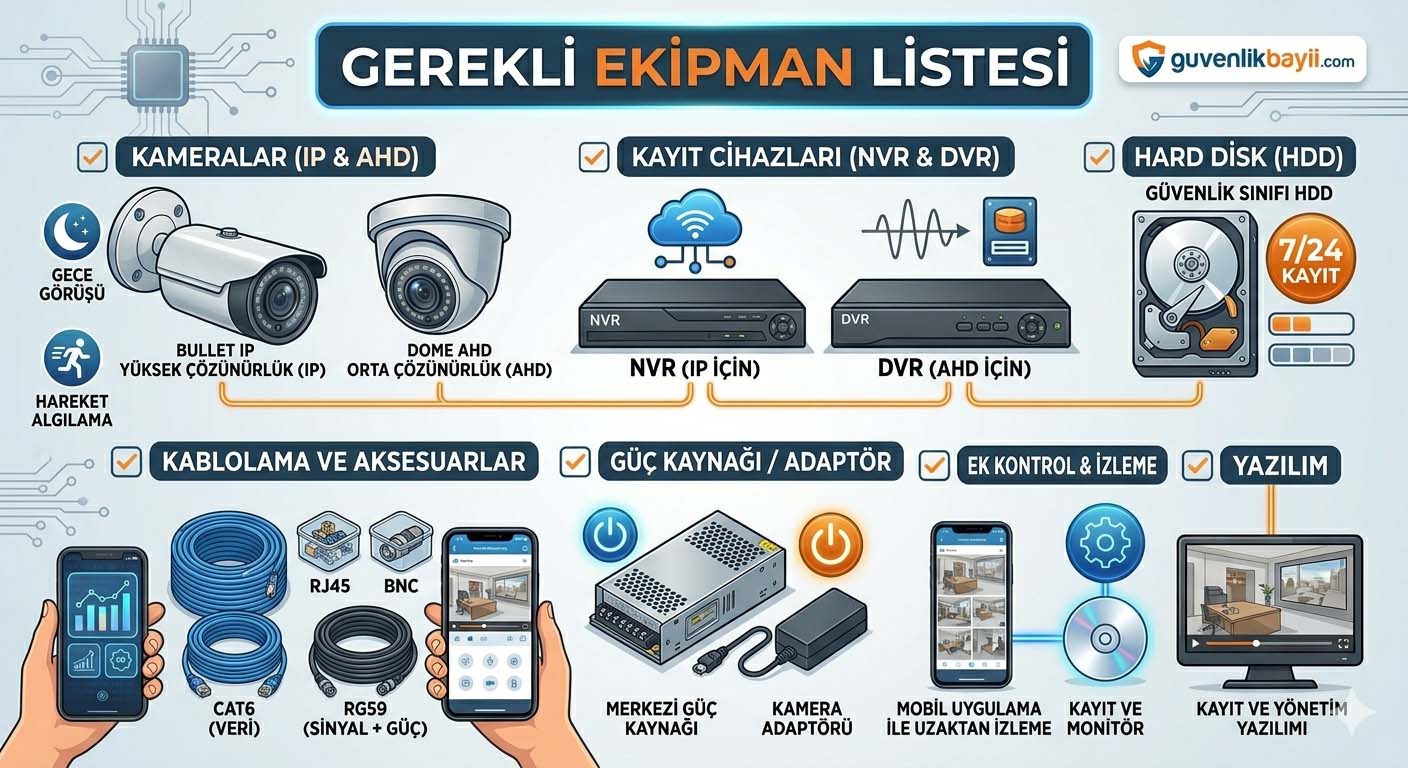 - Güç Kaynağı/Adaptör: Kameraların enerji ihtiyacı için.